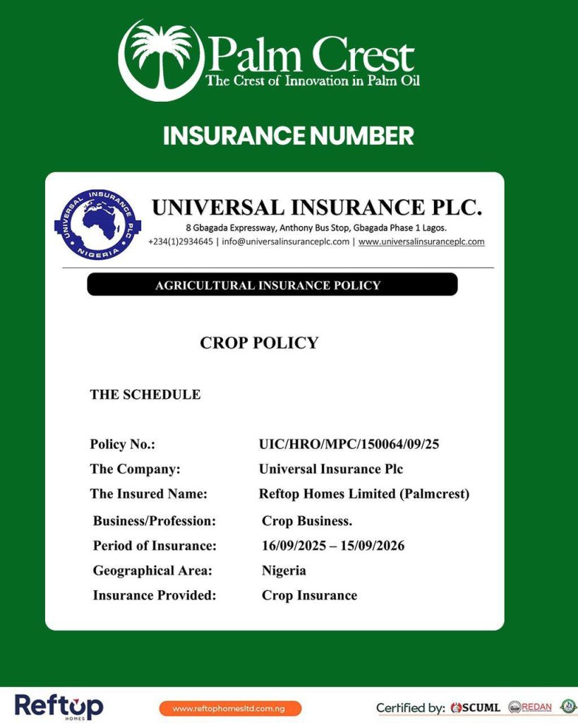 We believe strongly in securing your crops from natural disasters. Our crops are insured with Universal Insurance PLC with the insurance number – UIC/HRO/MPC/150064/09/25. With this, you have absolutely nothing to lose.